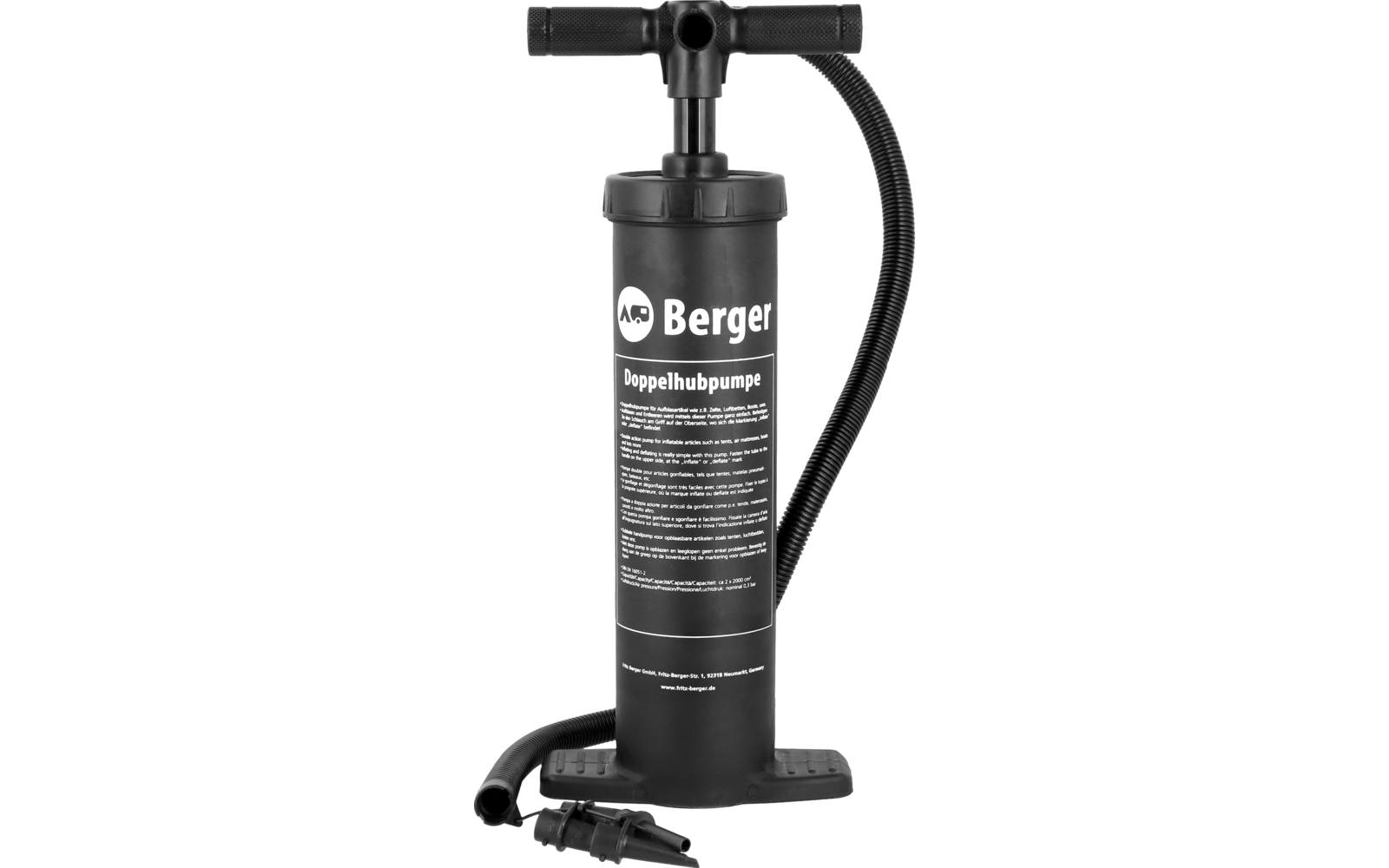 Die Berger Doppelhubpumpe sorgt für einen fortdauernden Luftstrom bei Zug- und Druckbewegung und eignet sich ideal zum Aufblasen und Entlüften großer Aufblasartikel. Die Pumpe verfügt über Bajonett-Verschlüsse, 4 Adapter und einen langen, nicht knickenden Schlauch.