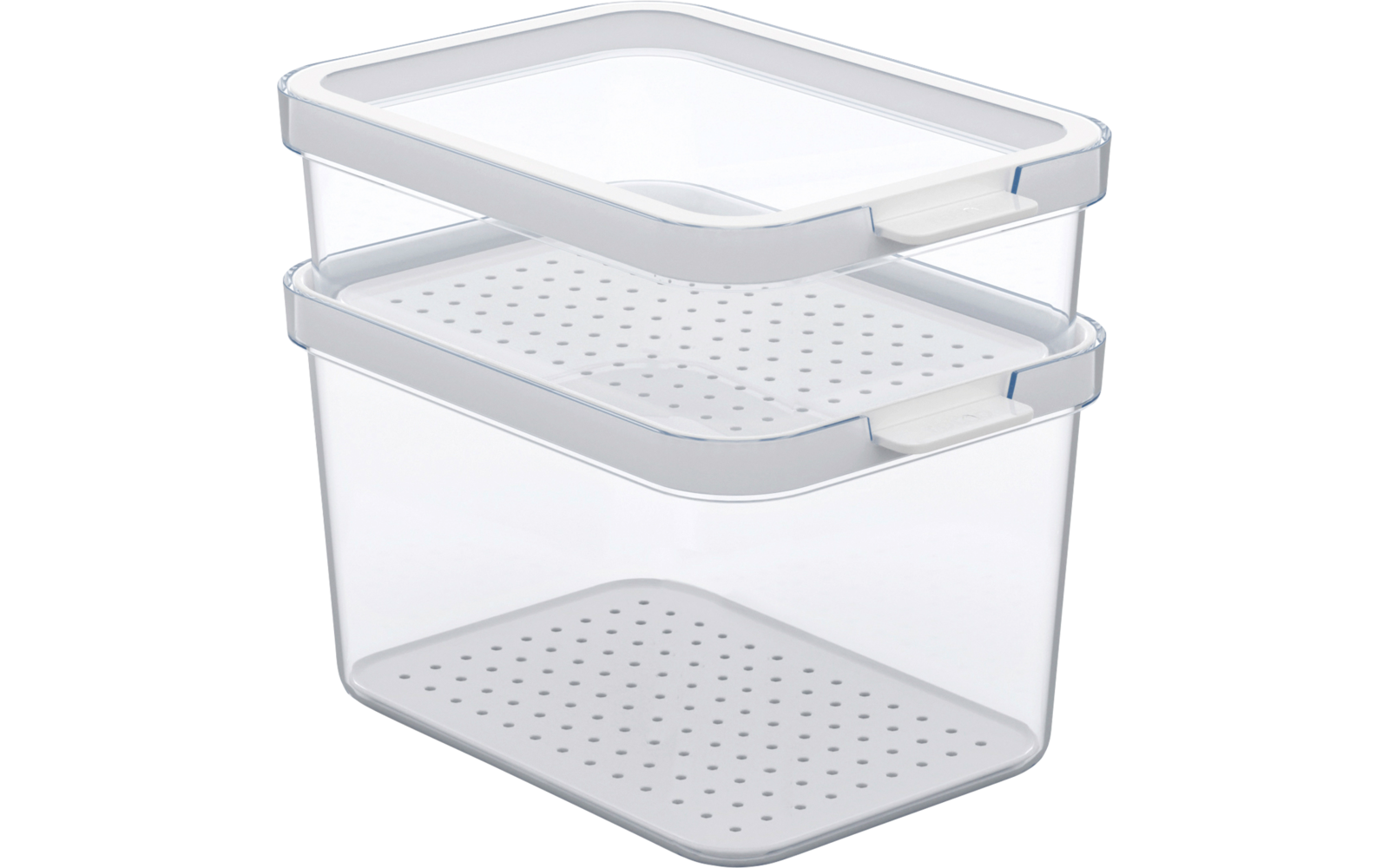 Der Einsatz mit kleinen Löchern lässt Flüssigkeiten abfließen, der Deckel ist um 180° drehbar für mehr Platz im Container oder bessere Stapelbarkeit und lässt sich mit einer Hand schnell öffnen und schließen.